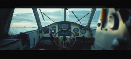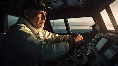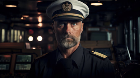Confident male cruise ship captain on the bridge of a luxury cruise liner, showcasing his leadership and navigation expertise, banner