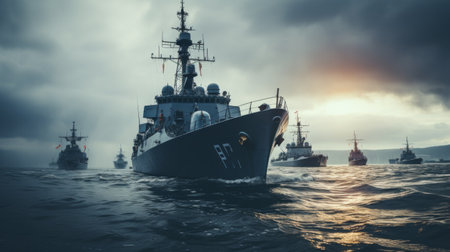 Group of modern military navy ships floating on sea