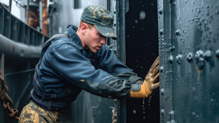The picture of the naval officer working on the ship or the battleship that sailing into the ocean, the marine require skills like teamwork, physical fitness, marine knowledge and engineering. AIG43.