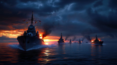 A group of ships are in the water, with one of them having a large fire on it. The sky is dark and cloudy, and the sun is setting. Scene is intense and dramatic