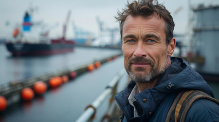 Portrait of a Man at a Harbor With Shipping Vessels in the Background During a Cloudy Day. Generative AI