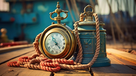 Vintage nautical maritime clock on rustic wooden background with ship instrument. That the image is generated using AI.
