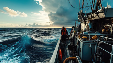 A rugged fishing boat cuts through turbulent ocean waves under a dramatic overcast sky, showcasing the resilience of maritime workers. AIG41