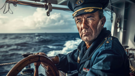 A bearded sailor in a blue uniform stands at the helm of a ship, looking out to sea with a determined expression on his face.