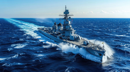 Panoramic view of a naval battleship at sea, with its imposing structure cutting through the waves on a clear, sunny day.