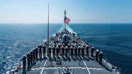 Us navy sailors stand at attention and salute on the deck of a warship sailing through the ocean, with the american flag flying proudly