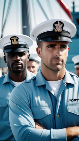Marine crew members standing in a row on the deck of a cruise ship. Luxury yachting. Generative AI