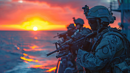 Close-up of a contemporary soldiers action squad wearing navy seals against a sunset backdrop.