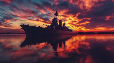 The USS Alabama stands majestically during sunset, with vibrant colors illuminating the sky and reflecting on the calm waters.