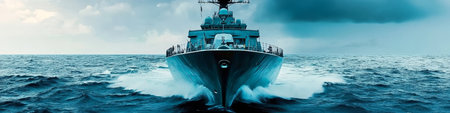 Naval Ship Navigating Rough Seas with Crew Onboard Under Dramatic Sky
