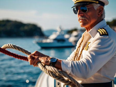 An elderly man with a kind smile, wearing a captains hat, enjoys a peaceful day on a boat as he gazes out at the sea under the warm sun.