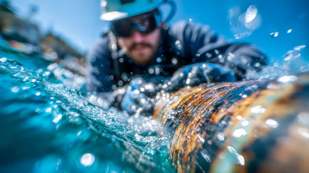 Diver inspecting a rusty underwater pipeline with splashes and bubbles, concept of offshore energy infrastructure maintenance and safety.