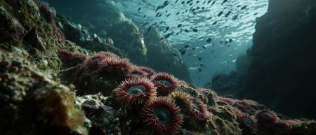 Cinematic view of rocky seabed showcasing vibrant anemones and dynamic sea life