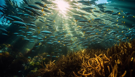 Vibrant school of fish swim in tropical underwater paradise generated by artificial intelligence