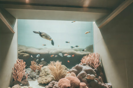 A sea turtle swims gracefully above a vibrant coral reef in a large aquarium. Various colorful fish surround the turtle and coral.