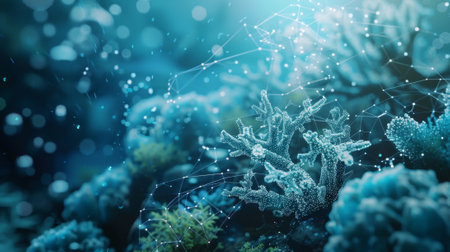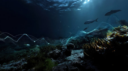 A visualization of realtime data analytics overlaid on a serene underwater landscape indicating coral health indices and marine life diversity derived from images captured by underwate