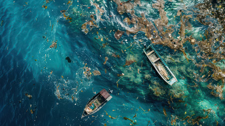 This vivid underwater scene showcases ocean pollution with colorful shells and marine life, highlighting environmental challenges, while a boat floats above.