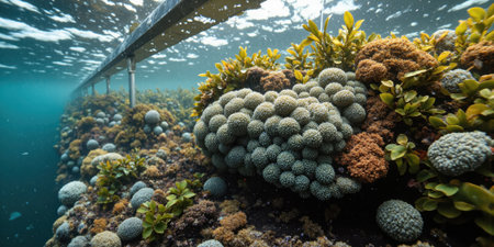 Regenerative Ocean Farming Underwater visualization of sustainable shellfish and seaweed polyculture creating abstract vertical garden in trending blue economy palette