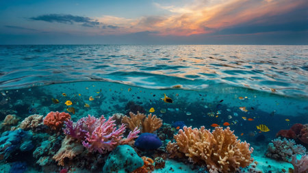 Underwater view of coral reef with fishes and corals at sunset