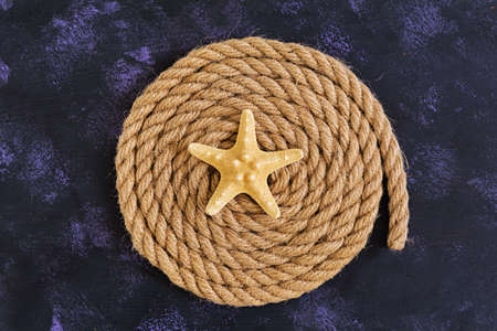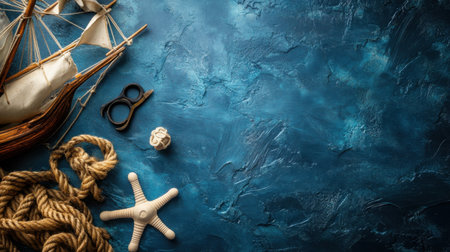 Explore the serene beauty of a nautical still life featuring a ship model, twisted rope, starfish, and scissors placed on a rich blue background.