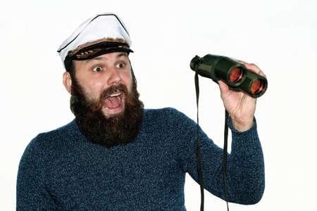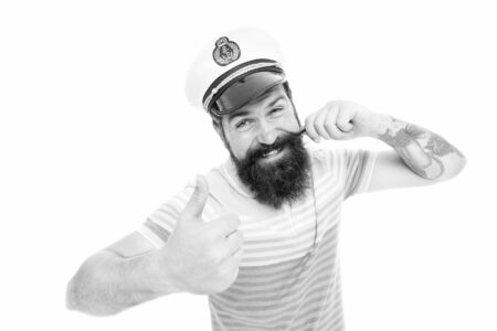 Captain of cruise liner. Brutal seaman isolated on white. Captain concept. Welcome aboard. Bearded man captain of ship. Sea cruise. Travel concept. Summer vacation. Hipster beard mustache sailor hat