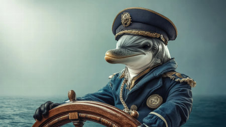 A dolphin in a captains outfit confidently holds a ships wheel while navigating through the ocean waves amidst a dramatic sky.