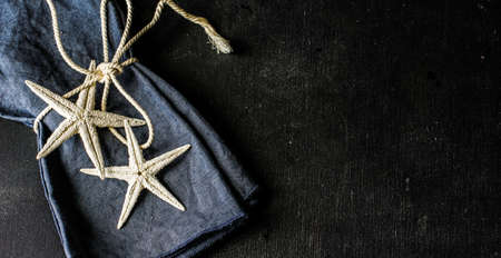 Summer vacation marine table setting with rustic plates and silverware on wooden background with copyspace