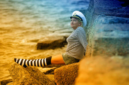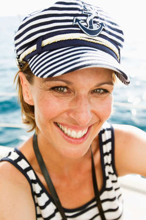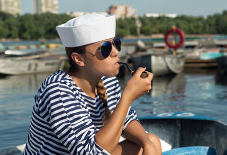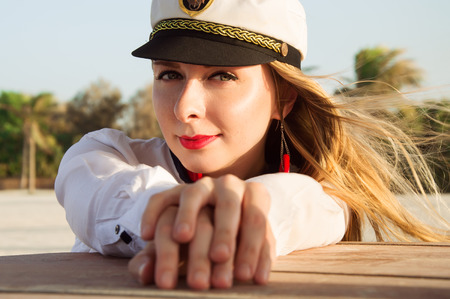 Attractive blond female skipper sits on deck with lifebuoy in striped dress in a sailors cap on a sunny summer day on calm blue sea water. Luxurious summer adventure, active marine vacations.