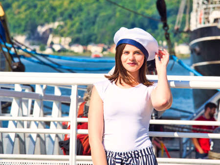 ROUEN, FRANCE - JUNE Circa, 2019. Portrait of the beautiful elegant luxury brunette model wearing a hat which stands on a schooner at Armada exhibition in France