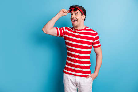 Photo of amazed positive young man raise glasses look empty space isolated on pastel blue color background