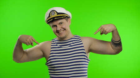 Young muscular sailor man pointing oneself with fingers proud, happy. Seaman guy smiling in sailors vest. Striped navy white and blue shirt, captain nautical hat. Isolated on chroma key background