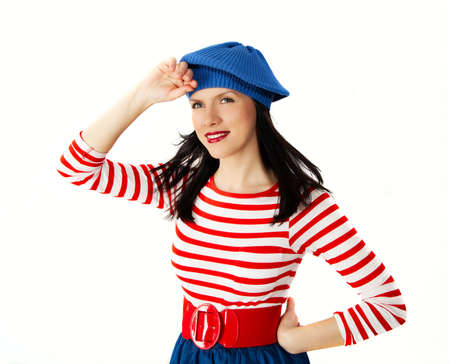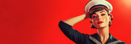 Elegant sailor girl in a classic 1950s style outfit exudes confidence, capturing attention with her striking blue eyes and inviting smile against a soft background, banner