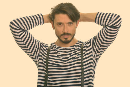 Half Body Shot of a Serious Man with Long Beard Wearing Trendy Black and White Stripe Shirt and Sailor Hat Attire, Crossing his Arms While Looking at the Camera.