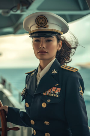 A young female Navy officer in uniform, confidently navigating a ship, representing strength and diversity in the military.