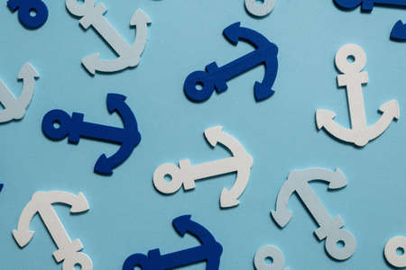 White anchor and fish on a blue background, maritime sea life, sailing trip, summer vacation, tourism concept, harbor