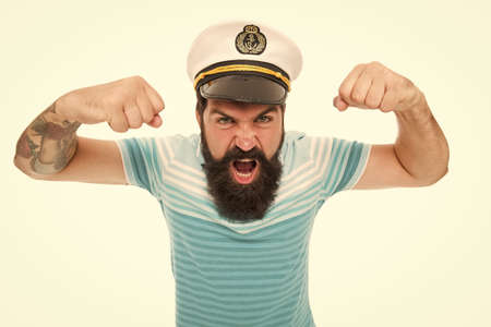 brutal man in sailor hat. summer marine fashion style. male power and anger. travel and people concept. navy day. tourist on summer vacation. bearded man in captain cap isolated on white