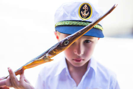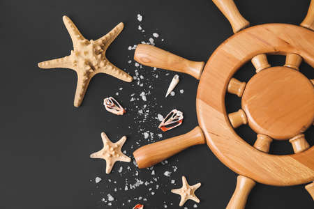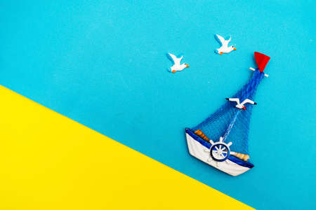 wooden vintage boat, dolphin, towel, boat and sea shells over blue background
