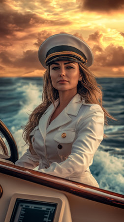 A professional and commanding female cruise ship captain at the helm, her uniform reflecting her authority as she skillfully navigates during a stunning sunset