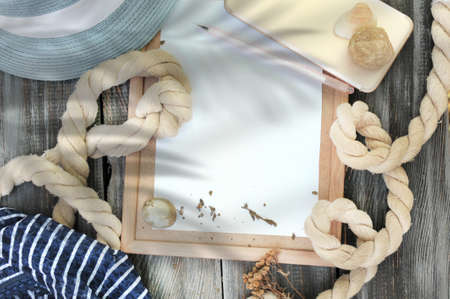 Sea style mock up with empty frame, outdoor photo with palm shadows