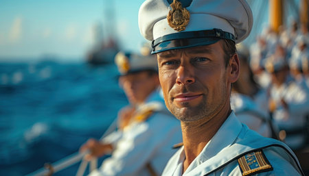 The picture of the military working as the marine captain for sailing the boat, the captain require skill like leadership, technical knowledge, management, weather awareness and safety focus. AIG43.