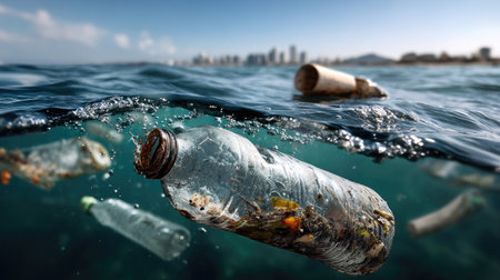 This image captures plastic waste floating in the ocean, highlighting environmental pollution. The backdrop features a city skyline, emphasizing the need for environmental awareness and ocean conservation efforts.