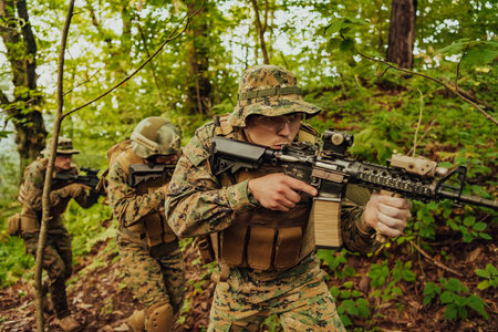 A group of modern warfare soldiers is fighting a war in dangerous remote forest areas. A group of soldiers is fighting on the enemy line with modern weapons. The concept of warfare and military conflicts