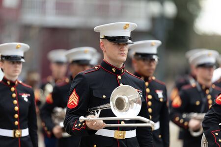 New Orleans, Louisiana, USA - February 23, 2019: Mardi Gras Parade, Members of the United States Marine Corps Marching Band performing at the mardi gras parade