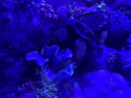 Beautiful aquarium with different types of fish and corals in the neon light in Prague, Czech republic