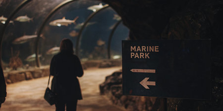 Enchanted female tourist walking through transparent underwater tunnel surrounded by marine creatures swimming in aquarium creates magical atmosphere for memorable vacation experience.