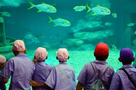 Asian young woman looking at the fishes in the sea tank, Thailand.