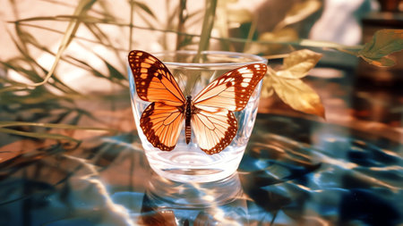 Generative AI : A tall beautiful glass with pure clean natural mineral water and an orange butterfly against a green lawn background closeup macro
