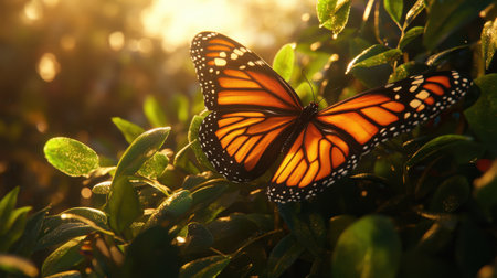 Sunlight highlights a giant butterfly on green leaves, blending beauty and nature stillness.