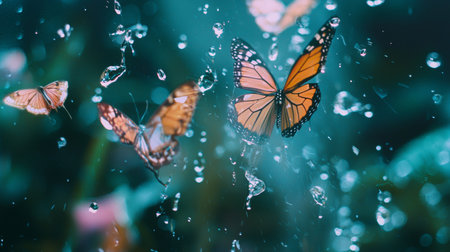 A magical and dynamic scene featuring vibrant butterflies flying amidst sparkling water droplets, creating a whimsical effect.
