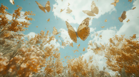 Vibrant butterflies soar above colorful flowers in a serene garden setting during a sunny afternoon